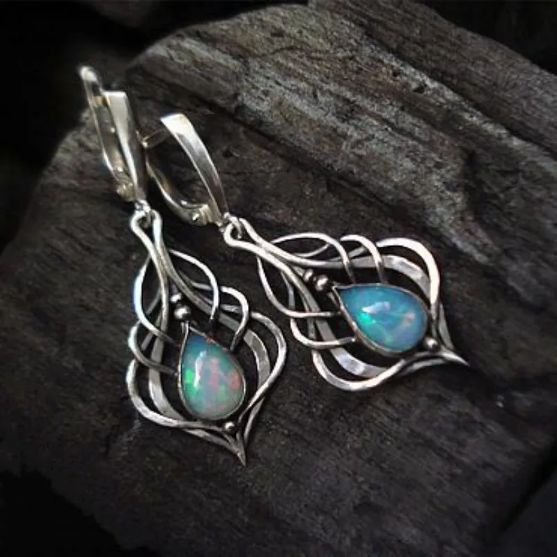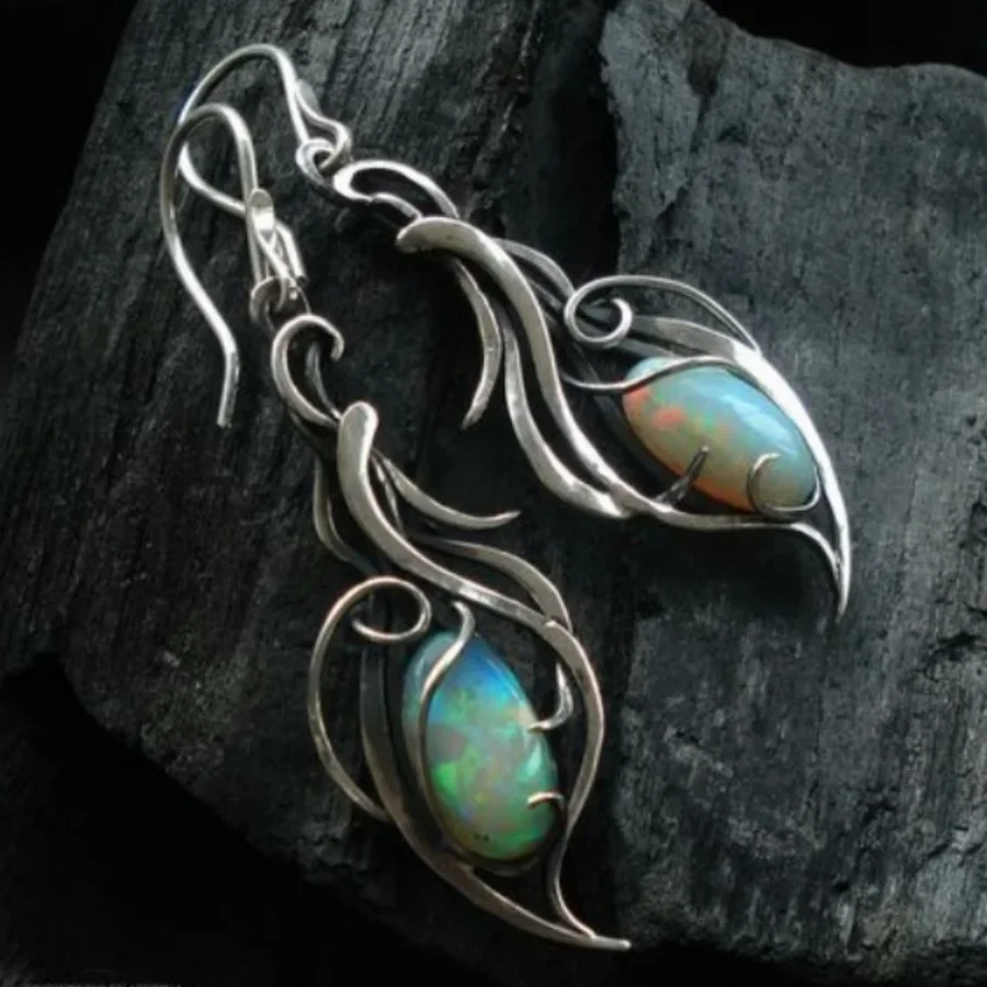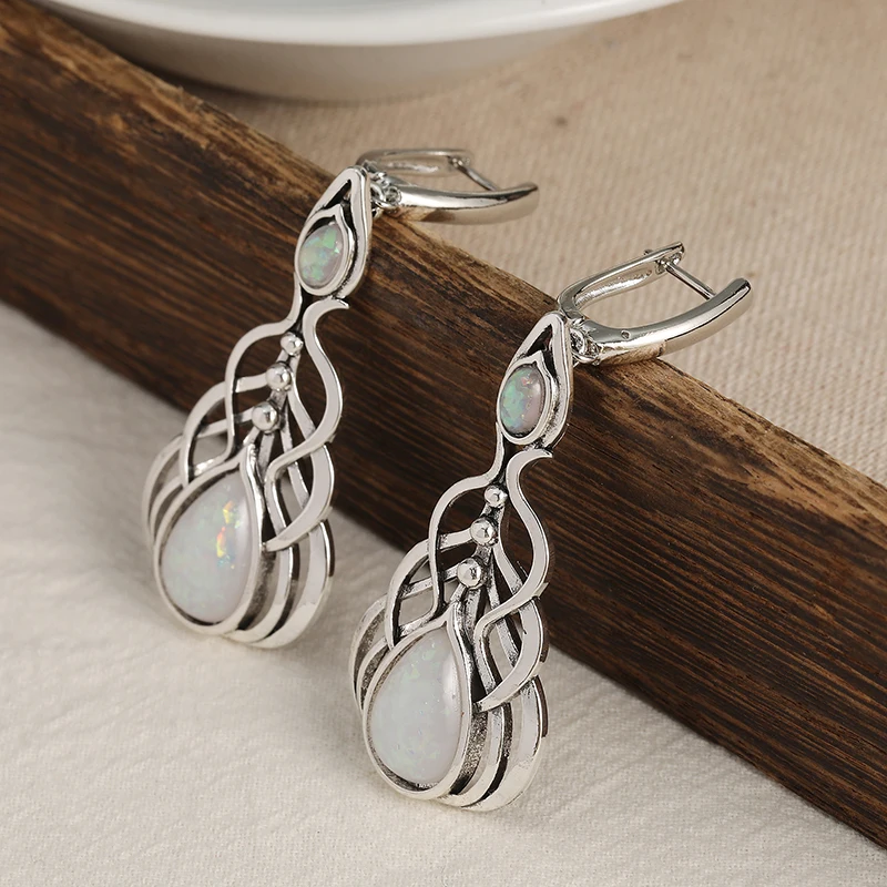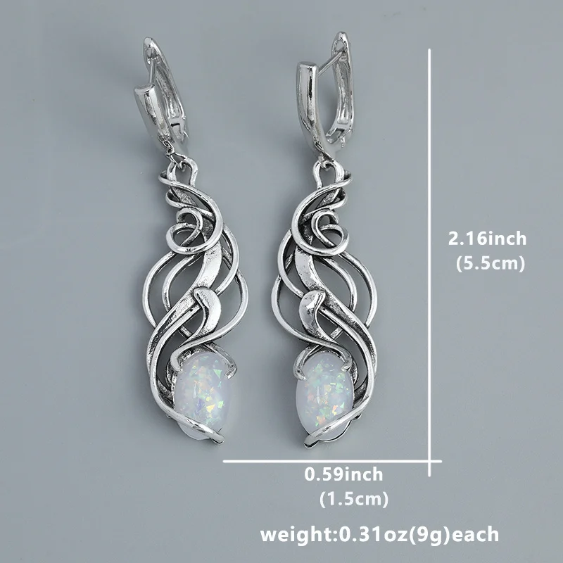 Vintage Oval Opal Decor Dangle Earrings Bohemian Elegant Style Alloy Silver Plat
